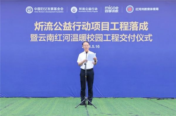 交付仪式上,云南省红河州委常委、州人民政府副州长吕进登台致辞,他首先代表红河政委、州政府向中国妇女发展基金会、炘流公益行动、四季沐歌集团表达了诚挚的感谢。吕进在讲话中提到,“今天对于浪堤中学在内的5所学校来说都是个好日子,因为从今天起,四季沐歌捐赠的空气能等清洁能源采暖·热水设备正式投入使用,全校师生们都将告别过去只能洗冷水澡的日子,尤其是在北风凛冽冰冷刺骨的冬天,孩子们能够用上热水这是一件多么让人欣慰的好事。”