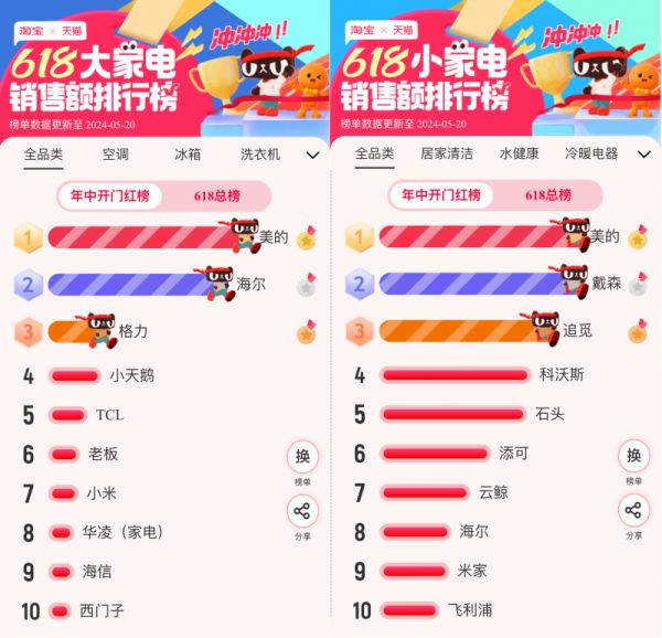 截至5月21日15:00点,天猫618家享生活的品牌排行榜显示,美的、海尔、格力领跑大家电品牌榜前三;美的、戴森、追觅领跑小家电品牌榜前三。