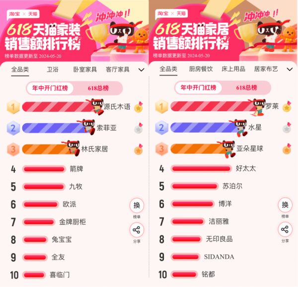 源氏木语、索菲亚、林氏家居领跑家装品牌榜前三。新锐品牌亚朵星球表现亮眼,与罗莱家纺、水星家纺登顶家居品牌榜前三。淘宝家装排行榜,索菲亚造家店、小半家具Half House、一具一家 美式标杆店包揽前三。在淘宝App搜索“家享生活618排行榜”可查看榜单。