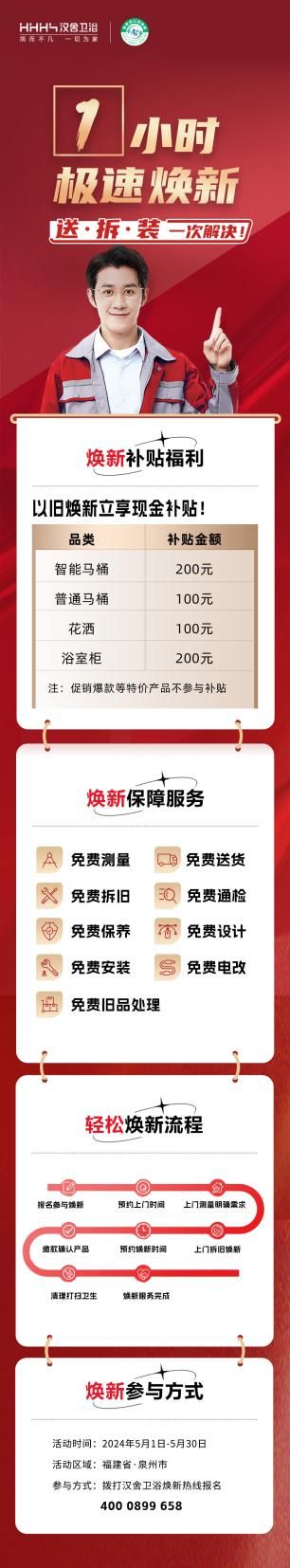 今年3月,国务院印发《推动大规模设备更新和消费品以旧换新行动方案》,汉舍卫浴积极响应有关部门号召,投入千万补贴,特推出卫浴以旧换新专项行动。
