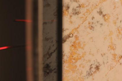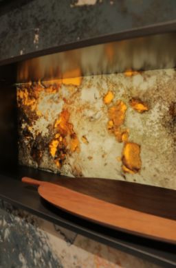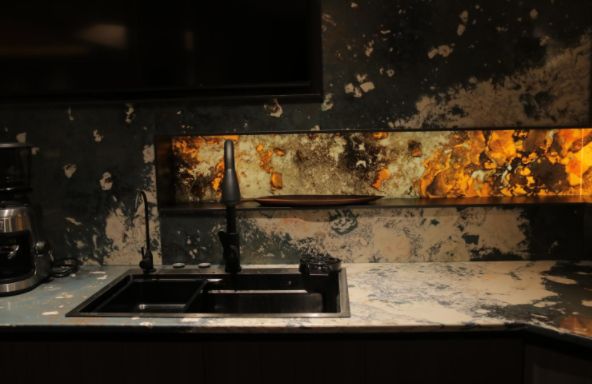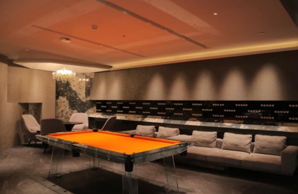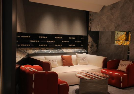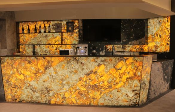 艺术审美介入空间,打破单一的局限感和想象,展示区另一端,奢石背板在橙色灯光的映照下显得尤为显眼,暖色调灯光与奢石自然纹理相得益彰,创造出一种温暖而奢华的视觉效果。