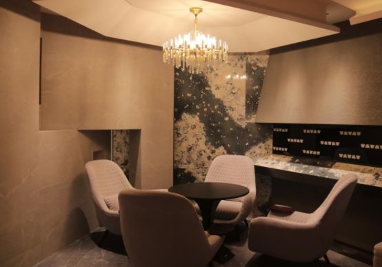 进入展厅,首先映入眼帘的是奢石透光水吧台,将参观者从喧嚣的世界隔离开来,进入一个只有奢石的空间,在增加空间层次感的同时,创造出一种艺术美感的外观,展现出奢石的表现力和生命力并营造了一种探索的期待。