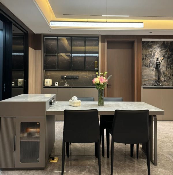 客餐厅一体化设计,满足了这个家庭所关注的互动需求,也让空间看上去更显宽敞明亮。在餐厅增加暖光源,冷酷的线条与柔和的光线相结合,烘托出餐厅的轻奢格调。灰色大理石的岛台与灰色餐椅形成了鲜明的对比,不仅节省了空间,还增加了收纳功能简约而不失时尚感,让人在用餐时也能感受到一种轻松愉悦的氛围。