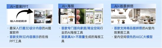 基于这样的行业需求之下,酷家乐发布电商解决方案,为家居企业和出海卖家提供电商设计、营销设计、创意设计利器。酷家乐电商解决方案涵盖商品图设计、短视频营销、3D互动展示、企业数字展厅等商品营销展示能力,15分钟设计师就能搞定一套商品图。此外,酷家乐电商解决方案还包含AI+提案PPT、AI+海报、AI+商品图拼搭等AI设计应用,为出海企业提升设计效率和优化用户体验上,提供AI技术助力。