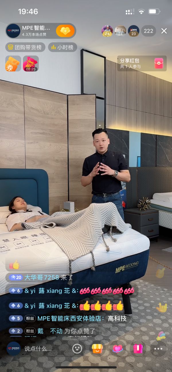5月25日,MPE携手全国经销商,点燃了“618以旧焕新全国启动大会”的烽火,誓将智能睡眠的新篇章推向高潮。当晚,MPE智能床在抖音「MPE智能床总部」直播间开启直播,瞬间成为万众瞩目的焦点。此次直播不仅是一次产品展示,更是一次品牌实力的全面展现。直播过程中,MPE智能床以其卓越的品质和创新的功能,吸引了大批观众在线观看和互动。