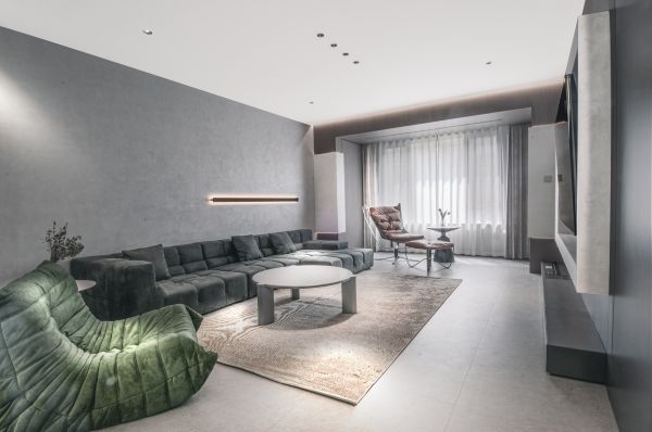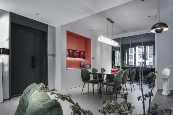 【李政】:这个案子的地理位置处在闹市街区,我想营造的感觉是:繁华的都市中心,有一处宁静放松的空间,那里便是家。所以在客厅里,我用墨绿、灰白黑这样比较沉稳的色调,呈现出一种寂静舒适、适合放空的感觉。丝绒质感的大沙发,让人很想陷进去,在上面待个一整天;合上窗帘,阳光隐隐洒进来,不会过分明亮,充满自然的惬意感。