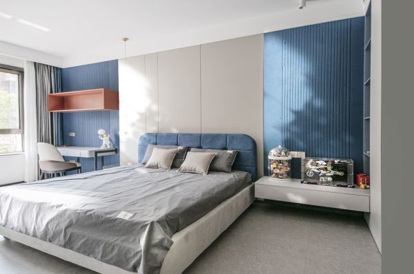 卧室里,我们也增加了一些亮色,比如蓝色和红色,让空间有一些色彩的冲击感,整体更加充满生机。