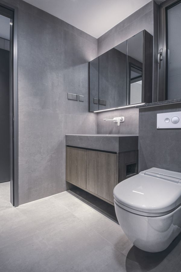 卫浴空间里,我们从实用性的角度出发,把马桶、底柜都做个悬浮设计,打理更加方便,同时可以避免死角滋生细菌。