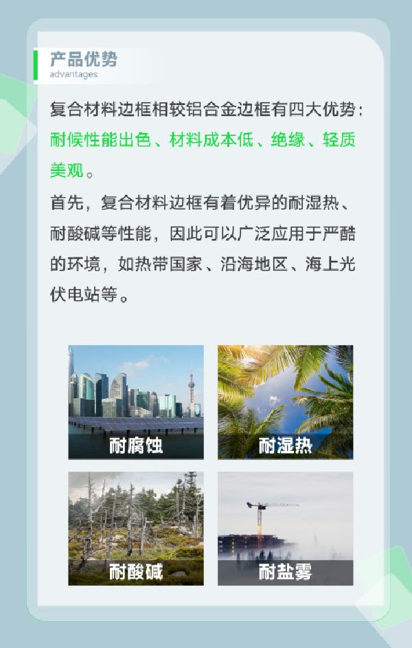 复合材料边框相较铝合金边框有四大优势耐候性能出色、材料成本低、绝缘、轻质美观。首先,复合材料边框有着优异的耐湿热、耐酸碱等性能,因此可以广泛应用于严酷的环境,如热带国家、沿海地区、海上光伏电站等。