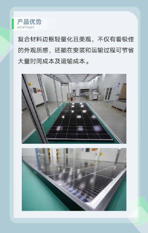 复合材料边框轻量化且美观,不仅有着极佳的外观质感,还能在安装和运输过程可节省大量时间成本及运输成本。