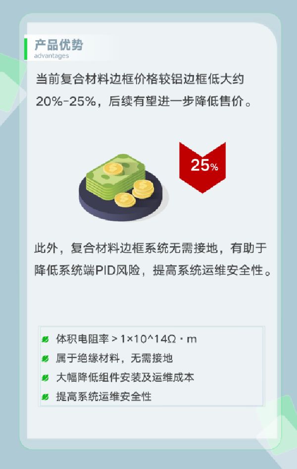 当前,联塑的复合材料边框价格较铝边框低大约20%-25%,后续有望进一步降低售价。此外,复合材料边框系统无需接地,有助于降低系统端PID风险,提高系统运维安全性。
