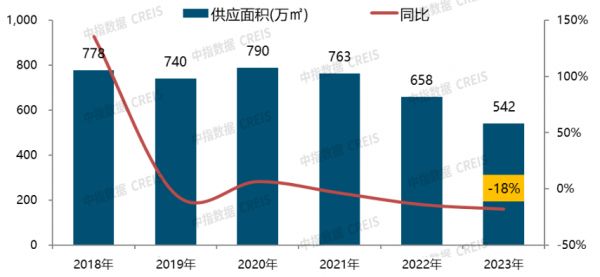 数据显示,北京商品住宅供应规模自2018年起高位运行,2018-2021年新房供应规模均超700万平;2021年下半年楼市快速降温,房企推盘节奏开始放缓,同时叠加宅地成交大幅减少,2022年北京商品住宅(不含保障房)供应规模同比下降14%;2023年北京商品住宅(不含保障房)供应规模继续下滑,累计供应541.8万平,同比减少18%,处于近年来相对低位。