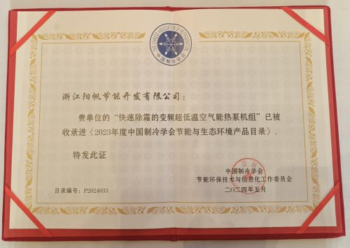 会议期间,中国制冷学会公布2023节能与生态环境产品和技术目录,浙江阳帆节能开发有限公司旗下“快速除霜的变频超低温空气能热泵机组”凭借在节能方面的突出表现,获得“中国制冷学会节能与生态环境产品”殊荣。这是阳帆在2024年斩获的又一行业权威机构认证的荣誉,也是对阳帆产品品质的认可。