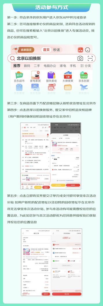 即日起至10月底(具体时间以活动页面为准),北京消费者在京东搜索“北京以旧换新”可直达专属活动页面,挑选心仪的商品和型号后,只需在商品页面下方配送楼层确认新机收货地址在北京,选择以旧换新服务,按照步骤提交家中旧机品类和品牌完成旧机估值,最后点击立即购买并提交订单完成支付即可享受本次活动优惠。