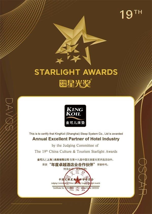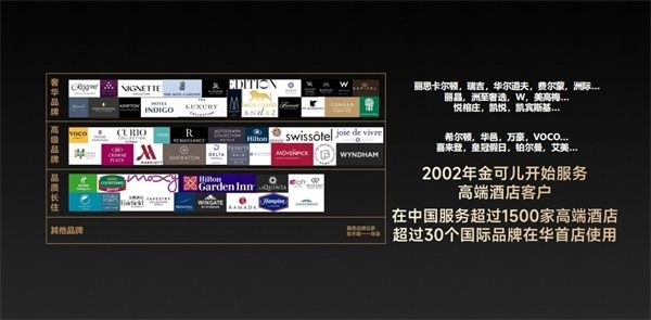 历经百年时光沉淀,金可儿床垫凭借专业护脊实力和高端奢华质感,获得了酒店行业的广泛认可,并连续12年荣膺“中国文旅奥斯卡”——酒店星光奖。作为百年高端寝具品牌,金可儿在全球服务超过200个国际酒店品牌,为6000多家高端酒店宾客提供金质好眠,在国内就有超1500家高端酒店合作客户,包括洲际、万豪、希尔顿、世茂、松赞、长隆以及锦江、万达、华住、开元等知名酒店集团。