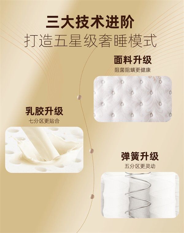 在恒温透气之外,“世茂皇家艾美+”新品床垫面料、乳胶、弹簧三大技术迭代升级,应用阻菌阻螨面料,长效守护洁净健康;七区天然乳胶科学配比,灵动贴合人体曲线,适配任意睡姿;升级五区灵动感应弹簧,分区承托工学护脊,独立袋弹簧静音无扰,打造五星级奢睡体验。3D立体绣花工艺,尽显优雅奢华质感,双重海绵久睡不塌,给予消费者恰到好处的温柔包裹。