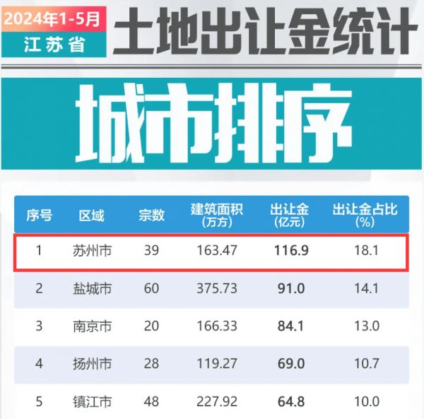 土地出让方面,今年以来苏州的表现超过省会南京。据好地大数据,今年前5月,江苏省共成交经营性用地(不含产业、配套用地)330宗,总出让金额646.2亿元,同比去年(1258.7亿元)减少612.6亿元,降幅48.7%。其中,苏州共成交39宗地,总成交建面163.47万平方米,总出让金额116.9亿元,占比达18.1%,在江苏省排名第一。