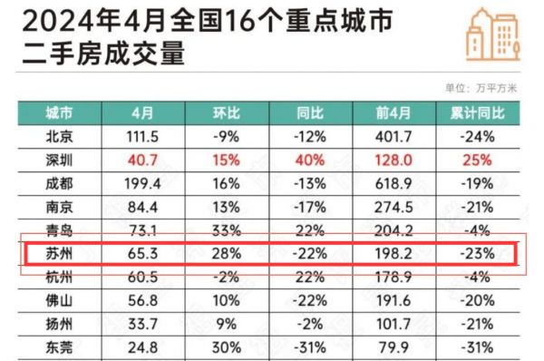 事实上,近期苏州的二手房市场表现不错。据克而瑞苏州数据,截至4月25日,全国16个重点城市4月二手房成交量中,苏州位居第六。4月份苏州市区二手住宅签约套数达6628套,环比增加38.14%,也创下了自2023年6月以来的成交新高,并接近2023年3-4月的高峰水平。