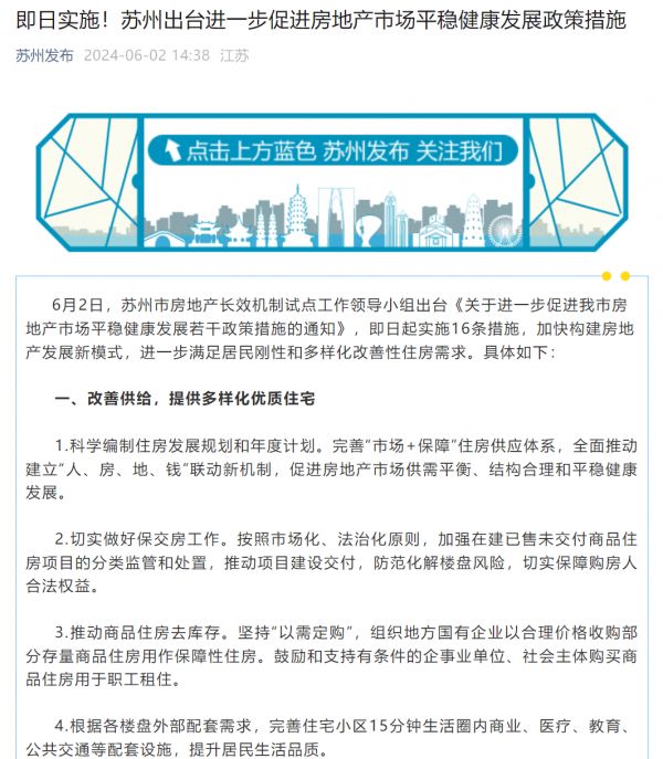 当日下午,据“苏州发布”微信公众号,苏州出台《关于进一步促进我市房地产市场平稳健康发展若干政策措施的通知》(以下简称《通知》),即日起实施16条措施。其中包括,苏州全市范围内不再审核购房资格,取消首套房和二套房个人住房贷款利率下限,下调个人住房公积金贷款利率0.25个百分点。同时,在苏州市购买或拥有合法产权住房且实际居住的非苏州户籍人员,可以申请办理落户。