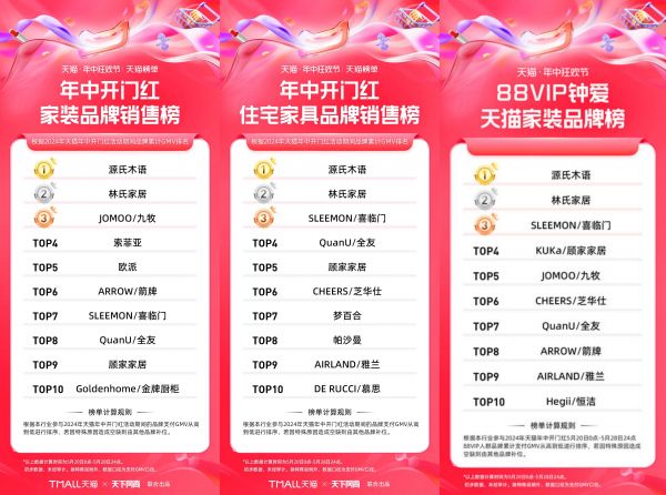 2024年5月28日,随着第一波天猫618高峰的结束,各行业618开门红的战报正式出炉。在今年的618年中大促中,实木家居品牌源氏木语凭借其卓越的产品品质、创新的营销策略以及优质的服务体验,再次夺得了天猫年中开门红家装品牌销售榜Top1、住宅家具品牌销售榜Top1以及88VIP钟爱天猫家装品牌榜Top1三项成绩。这一成绩的取得,也彰显了其深厚的品牌影响力和消费者认可度。