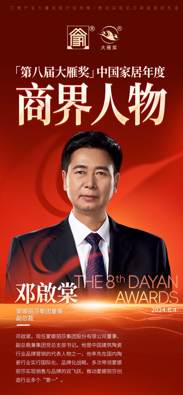 2024年6月4日,在新加坡·金沙酒店举行的「首届中国家居国际化高质量发展(新加坡)论坛暨第八届大雁奖颁奖盛典」现场,「第八届大雁奖——中国家居年度商界人物」最终获奖榜单正式揭晓。蒙娜丽莎集团董事、副总裁邓啟棠凭借在行业影响力、行业贡献、个人能力价值三大维度中的突出优势,从上百家居人物中脱颖而出,荣获“中国家居年度商界人物”称号。