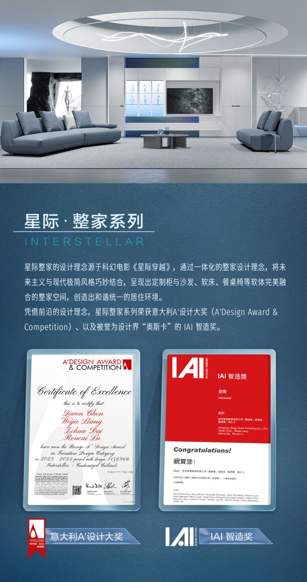 值得一提的是,意大利A'设计大奖和 IAI 智造奖是顾家整家定制继“金汐奖”“质点奖”等众多奖项之后的又一次国际认可。这不仅是对顾家整家定制设计的肯定,也是对整个中国家居设计行业的激励。顾家整家定制将继续秉承创新精神,为全球用户提供更多高品质、高设计感的家居产品。打造极具独有个性化、设计感的产品力,一站式满足消费者整家定制需求。(星际整家系列设计团队: 陈绮雯、梁伟杰、戴泽华、陆仁才 )