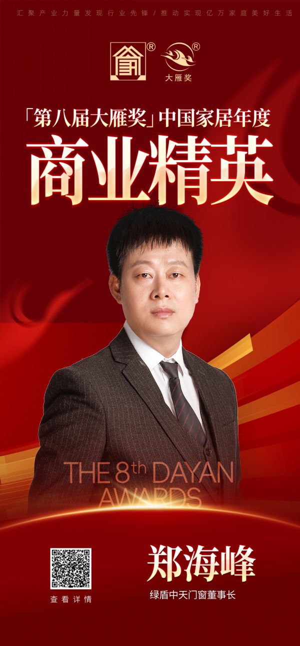 每一个成功的企业,都有一个灵魂人物。作为绿盾中天门窗掌舵人,董事长郑海峰先生凭借前瞻的战略眼光与出色的领导智慧,夯实绿盾中天门窗行业龙头地位。此次,荣获「中国家居年度商业精英」称号,更是高度肯定了郑董对行业所做的突出贡献。
