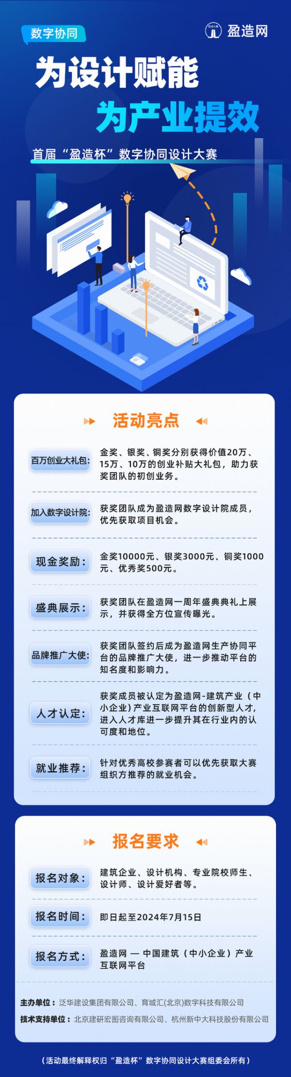 值此盈造网上线一周年倒计时100天之际,我们以"为设计赋能,为产业提效"为主题,隆重启动首届盈造杯数字协同设计大赛。诚邀全国各地的建筑企业、设计机构、专业院校师生、设计师以及设计爱好者,共同参与这场设计界的盛会,见证数字化设计的力量,助力中国建筑产业的升级与提质增效。