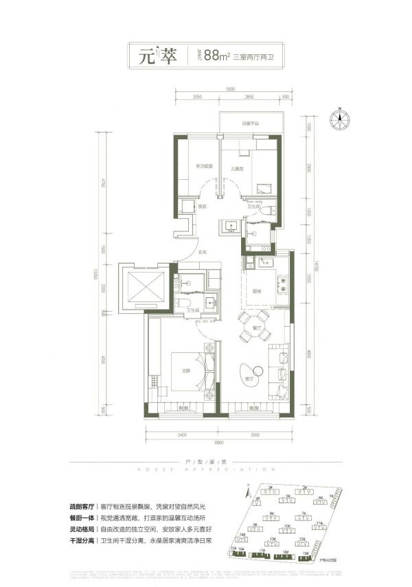 解析:88平三居双卫设计,客厅和主卧朝南,且均带飘窗,主卧套房设计,私密性好;客厅面宽3.6米,可以保证室内良好的采光;客卫干湿分离,北向两个卧室,多功能室可以根据需求变更功能,比如可以当做书房、琴房等。这户型属于功能性三居,适合刚需家庭。