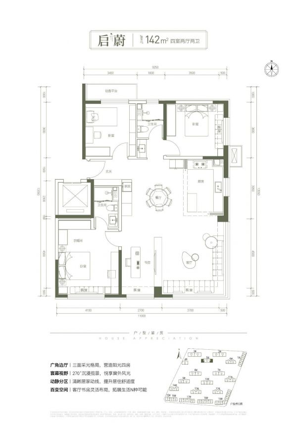 解析:142平改善四居,南向整体面宽11米,270度转角客厅设计,南向客厅、书房、卧室均带飘窗,客厅书房那里非实线部分可以根据需求打通,灵活布局。餐厅挨着厨房,餐厅的位置也更为宽敞。客卫是明卫,干湿分离。这户型方方正正,浪费面积小,适合改善家庭居住。