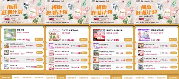 天猫上线“梅雨赶潮计划”,致力于拓宽用户对于各类家清新品的产品心智,同时,为 618 活动引流(跨店每满300减50),吸引消费者积极选购家清产品应对梅雨衣物发霉、房屋潮湿等困扰,达到消费者、品牌和平台的三赢。