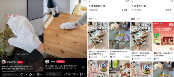 在小红书平台,天猫联动妙洁品牌,联手小红书KOL为梅雨季家居清洁发声,有效扩大了活动声量,吸引了更多居家人群对活动的关注,进一步加深他们对品牌的认知。在#梅雨赶潮计划 话题页下,作为用户的梅雨季家居清扫新搭子,妙洁除尘手套在KOL的演绎中,展示出了静电吸附灰尘、即用即抛的优越性能。截至6月7日,#梅雨赶潮计划 #家更多可能 话题页达成浏览量25w+,达人笔记曝光35w+。