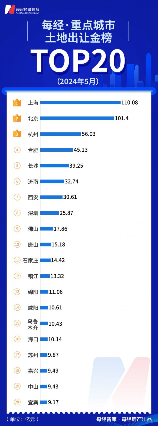 上海、北京、杭州等热点城市土地出让金仍是前三,合计出让268亿元,但热度较4月有所下降。