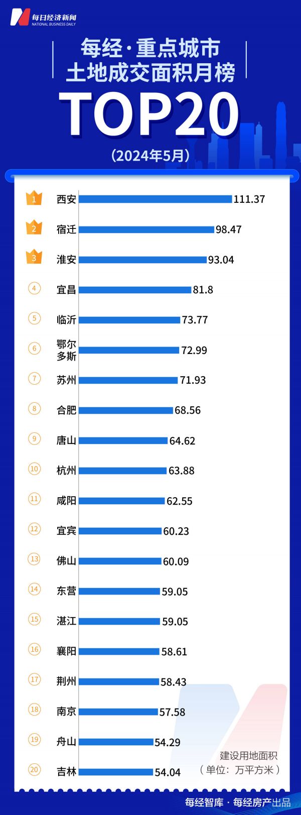 销售热度较高的西安市,5月土地成交面积排名第一,达到111.37万平方米;宿迁、淮安、合肥、杭州等长三角城市成交继续排名居前。从本月TOP20城市拿地房企情况来看,央企和国企继续扮演着土地市场主导角色,同时,民营企业也积极在重点深耕区域进行土地储备。