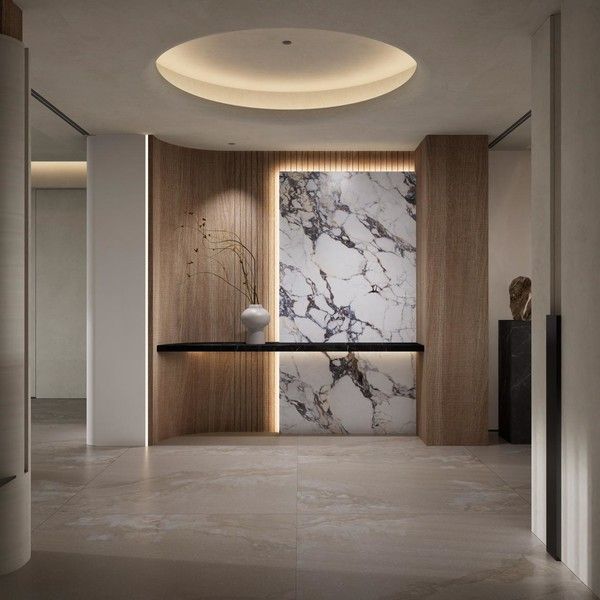 推门而入,暖色调的灯光为整体空间的精致浪漫基调埋下伏笔。无法拆除的立柱以弧形造型元素改造,柔化了传统玄关的生硬感,如同对归家之人展开的亲切问候与怀抱。