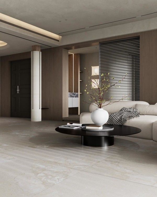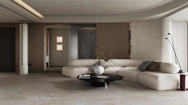 以英国画家透纳水彩画作为灵感的萨米特地砖从玄关一路延伸至客厅,更宽大的尺寸打造一体化奢阔视觉,自然的纹理搭配温润的颜色,温暖而不失格调。