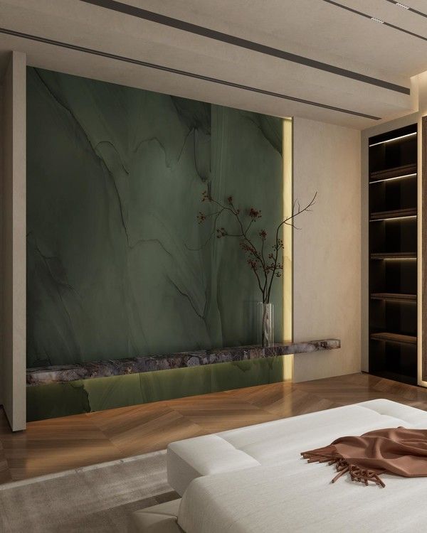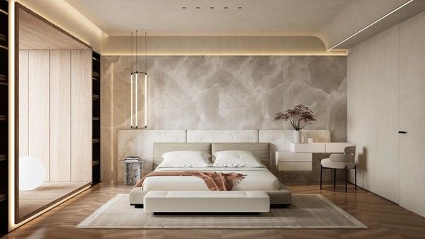 床尾一侧则以萨米特千里山色系列春辰岩板作背景墙,富于自然灵动感的色泽,恰似一幅浪漫精致的艺术画卷,透露着沉稳高贵的气质,无论是触感还是视觉,都为空间增添了丰富的层次质感。取自透纳水彩画灵感的美学纹理,更渲染出空间的春日浪漫气息,细节之美犹如春日的微风,温润入心,为空间注入浪漫、慵懒的生活姿态。
