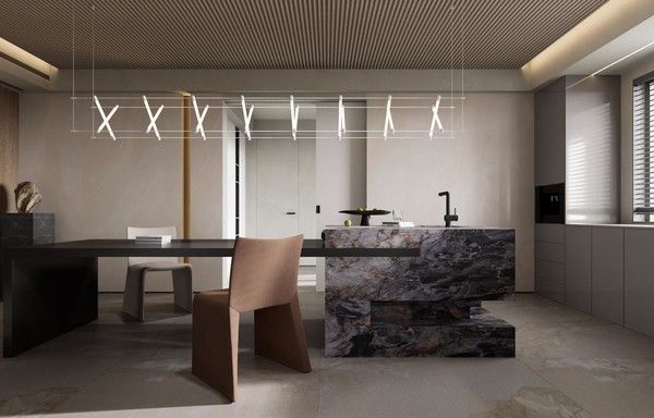 考虑到夫妻二人年轻化的社交习惯,设计师将餐厅打造成社交互动的欢聚场域。岛台与餐桌互补,同时链接西厨区域,极大地增强空间的趣味互动,为就餐、聚会提供了更多的场景可能。