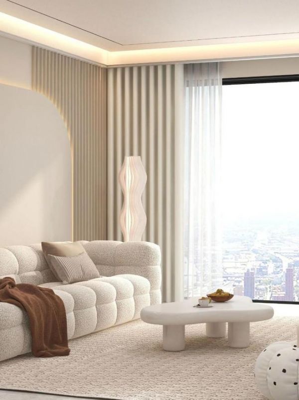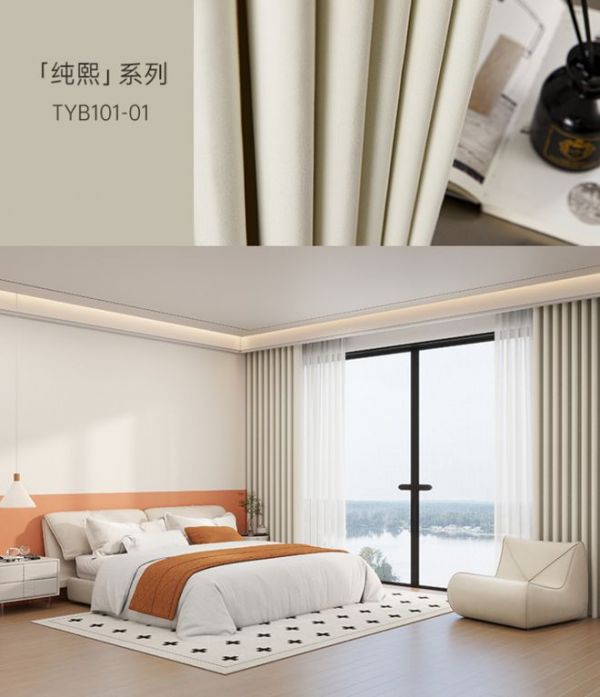 天洋奶油质感的窗帘,轻盈温柔,肌理设计不同,可随心搭配。例如舒适圈圈纱,细腻柔软,柔和哑光雾感,让奶油风更软糯可亲。或者是精致的竹节肌理,柔和宁静的奶油色调,85%遮光率,营造舒缓宁静的氛围,点缀静心的夏日生活。