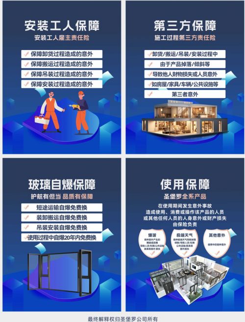例如,在许多人忽略的安装环节,为解决高空作业难买保险、安装人员不固定、理赔困难、保人不保物、投保麻烦、保险覆盖不足等门窗安装环节容易出现的“投保”难题,圣堡罗联合中国平安,为安装工人购买“雇主责任险”,施工过程投保“第三者责任险”保证“人+物”双安全。
