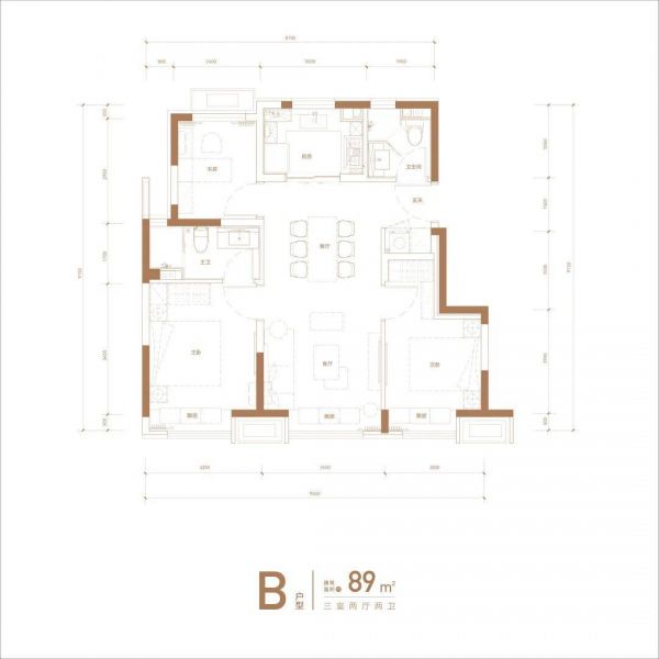 建筑面积约89㎡户型是三室两厅两卫的设计,南向三面宽和三飘窗。