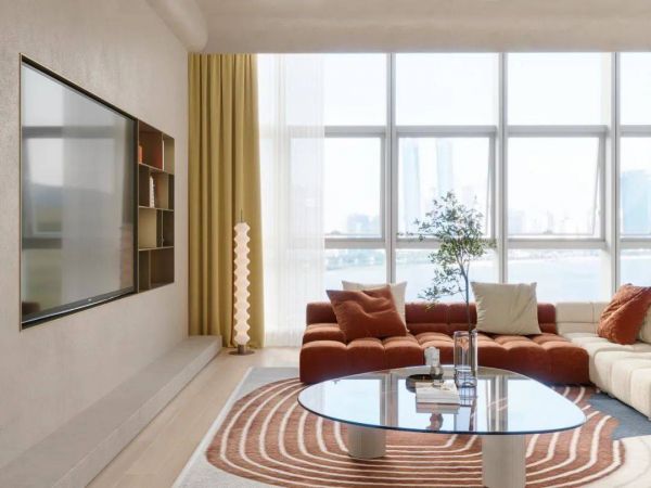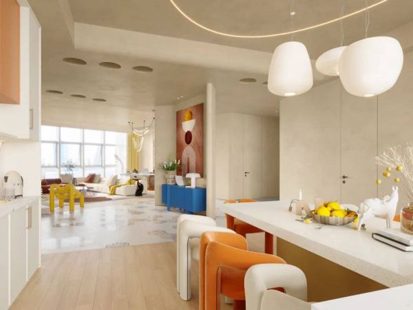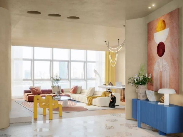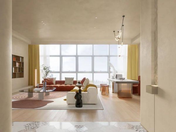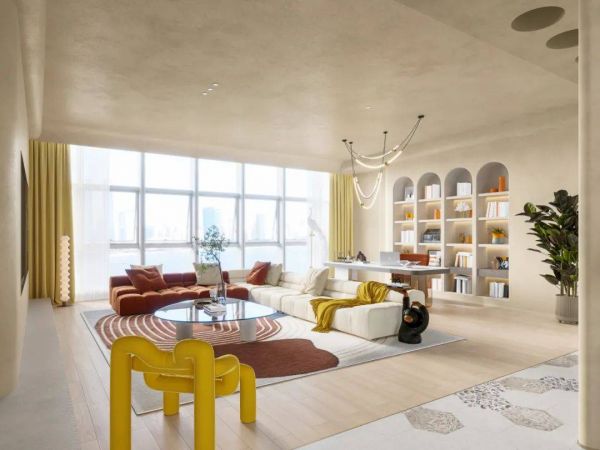 该设计充分利用大平层的优势,通过开放式空间布局设计,极大程度满足社交、情感联络需求,颠覆重提意义的空间划分,客厅与多功能书房合二为一。