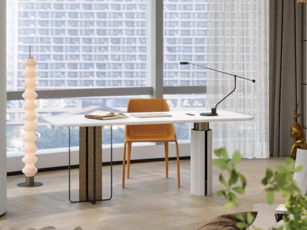 客厅中心配置了双向互动空间,打破客厅与书房的界限,让沙发形成自由动线的中心,不再是区分空间的量体。
