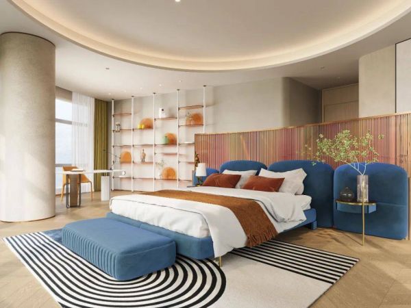 卧室镂空的靠背,运用了金属加亚克力艺术的设计,整体隔而不挡,为空间增添了更多的灵动与艺术性。返回搜狐焦点首页,查看更多