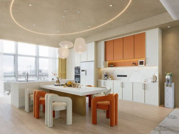整个空间造型凸显女性柔性之美。线条曲线舒畅,整体色彩采用了暖色为主,局部采用明亮的橙色家具位点缀,并以温润的木色为辅,让空间有放松自在的氛围。