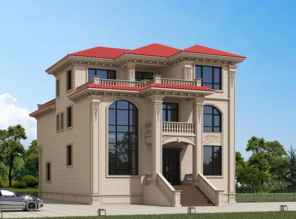 以山东白麻作为建筑外观主色调,加以精美的红色琉璃瓦屋顶点缀,让整座别墅沉稳而不失活力。精致的雕花、花瓶围栏及拱门造型,处处透露着欧式经典的高贵典雅,加上6D美石漆媲美真石的纹理及立体质感,使建筑外观显得庄重、气派。