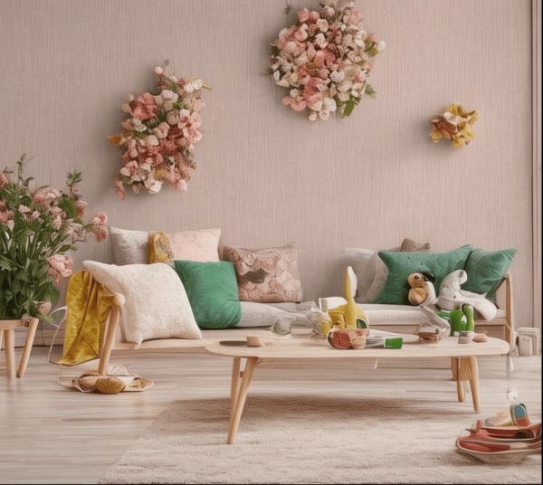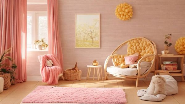 对于有孩子的家庭而言,在客厅采用威泽“翻糖粉”墙布,能打造梦幻温馨的居住体验。墙上橙黄色的装饰、绿树的壁画与粉色地毯、木椅以及米色地板相映成趣,营造出一个充满童趣、梦幻多彩的空间。在这里,孩子们可以自由地嬉戏,大人们可以安心地陪伴,共同享受快乐时光。