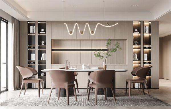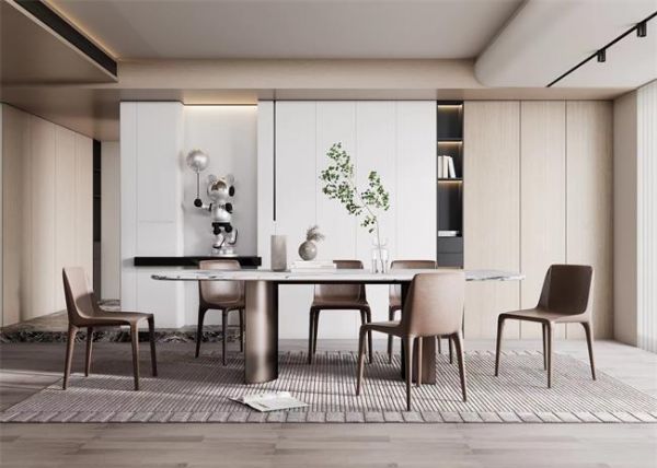 餐边柜与护墙板一体设计,简约纯粹,具有设计感的造型灯具点亮了空间装饰的浪漫。设计映衬和贴心功能,形成精致又有序的餐厅空间。地毯的铺设,让简约高级的餐厅,又增添低调的典雅感。