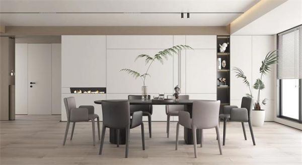 白色的门墙柜一体化设计,营造出冷静、典雅的氛围。绿植和质感细腻的木质拼接地板,为用餐环境增添自然气息。