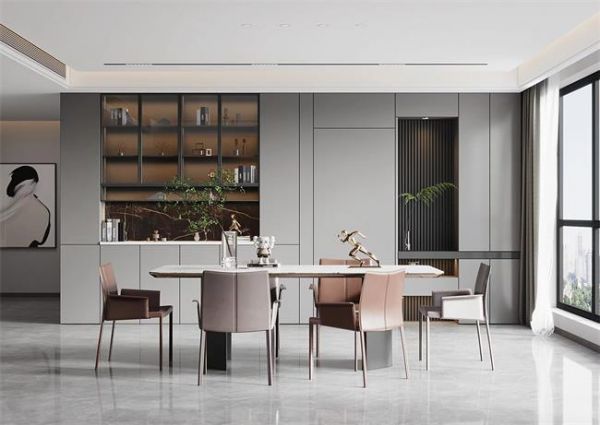 开放式餐厅呈现出整体时尚的感觉,在有限的空间里,将简约极致发挥,低调精致的餐厅酒柜,展现出与居住者相应的生活态度。